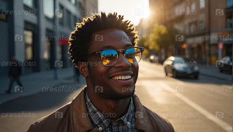 Молодой чернокожий мужчина с очками на улице, солнечный свет, студентка колледжа, столкнувшаяся с близорукостью экрана, цифровое обучение, оздоровление, модный городской стиль, текстовая зона