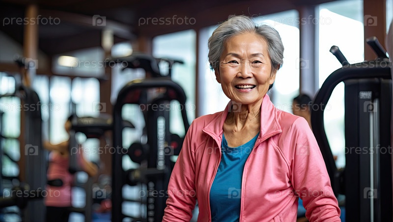 Азиатская пожилая женщина, около 75 лет, розовая спортивная куртка, тренажерный зал, здоровый, оздоровление, улыбка, фитнес, жизнеспособность, старение, программа оздоровления, редакция, промо, текстовая область