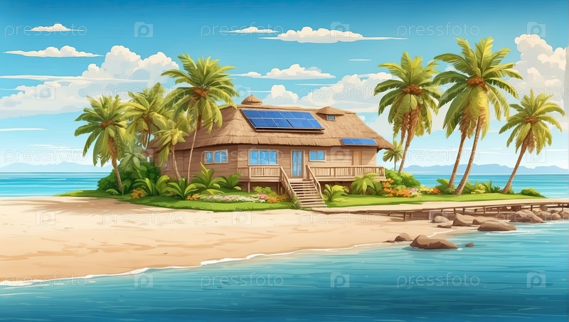 Приморский бунгало с видимой солнечной системой, устойчивый пляжный туризм, экологически чистая аренда, энергоэффективная вилла, мультфильмы цифровой иллюстрации