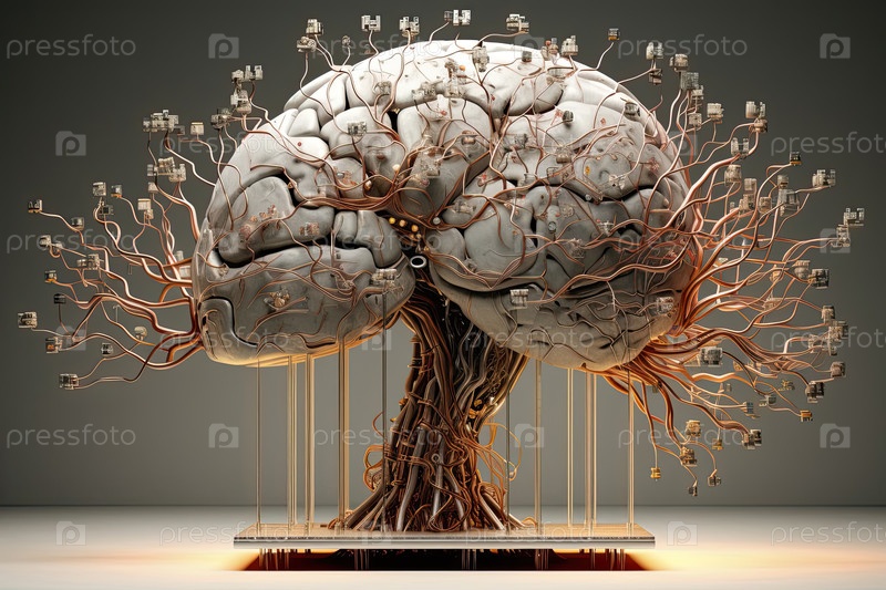 Биологическое дерево в форме нервного мозга, интеграция природы и технологий, концепция ИИ, рост данных, нейронные сети, экологические биотехнологии