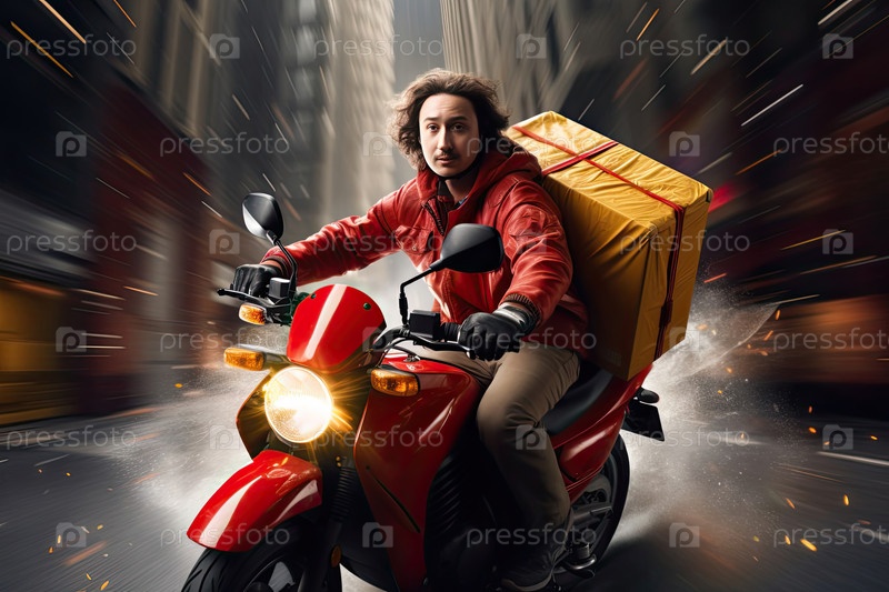 Мужской курьер на красном мотоцикле быстро доставляет посылки по городу, быстрая городская логистика, экспресс-сервис, онлайн-магазин и доставка в ресторане