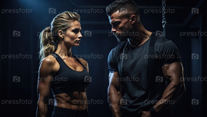 Кавказские мужчины и женщины профессиональные фитнес-тренеры, тренировочная команда, клубный персонал в тренажерном зале, коучинг, спортивная одежда, портрет, фитнес-клуб, печатные издания, веб-страницы