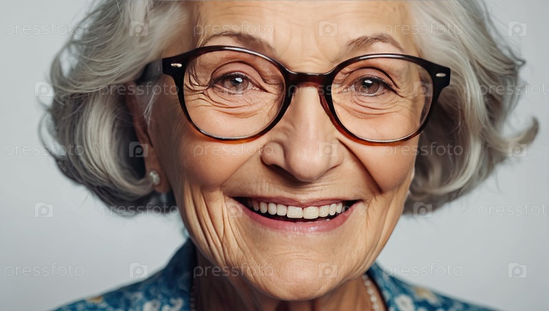 Счастливая пожилая женщина с короткими белыми волосами, круглые очки, цветочная блузка, студия, мягкий синий фон. Трудность в чтении, возрастная одежда, комфортное соответствие, информация о здоровье семьи, иллюстрация блога