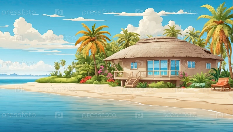Приморский бунгало на песчаном пляже, индивидуальное тропическое жилье, семейный отдых со всем включенным, туризм, плакат туристического агентства, цифровое искусство