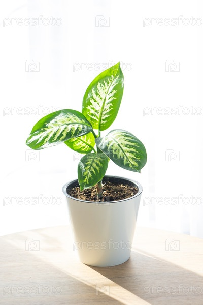 Dieffenbachia в белом горшке, солнечный интерьер, минимальный уход, простое полив, без прямых лучей солнца, регулярная чистка листьев, использование для декора, журнал растений