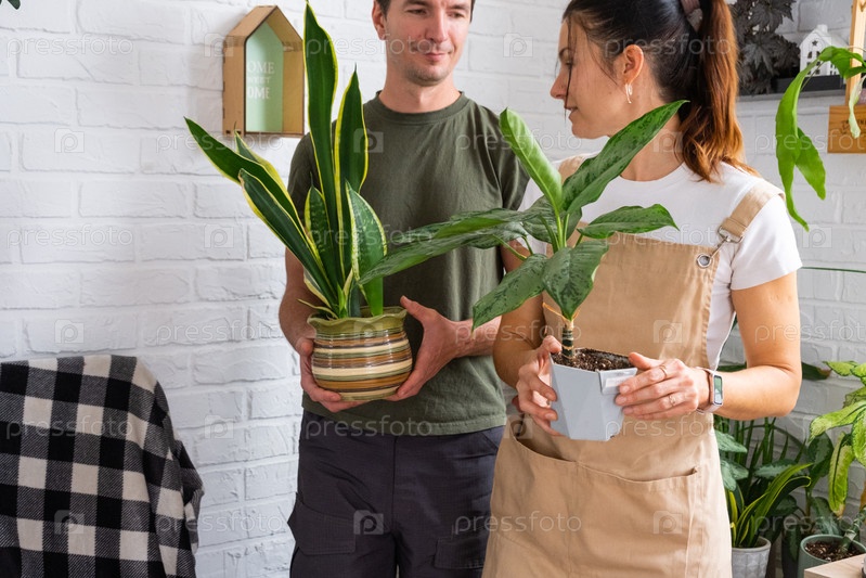 Улыбающаяся пара держит в горшке сансевирию и поливную банку, расслабляясь вместе среди пышных комнатных растений, современного интерьера, взаимного хобби, домашней зелени