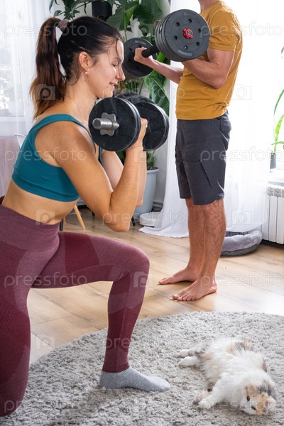 Спортивная женщина и мужчина, разделяющие домашнюю тренировку, веселый кошачий компаньон на ковре, семейный уход за здоровьем, современная жизнь, связь с питомцами