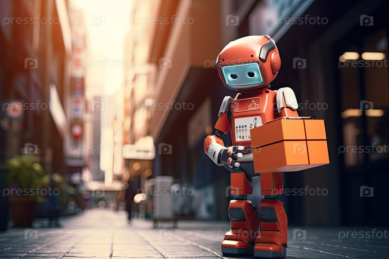 Дружелюбный оранжевый робот-почтовец, держащий посылку в городской аллее, современные курьерские технологии, инновации доставки для электронной коммерции, умная логистика и транспортировка на последнюю милю