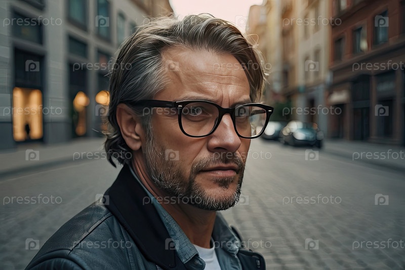 Кавказский мужчина средних лет в очках, деловая одежда, спокойная эмоция, городская улица, проблемы со зрением, необходимость коррекции, офисный фон, пространство для текста