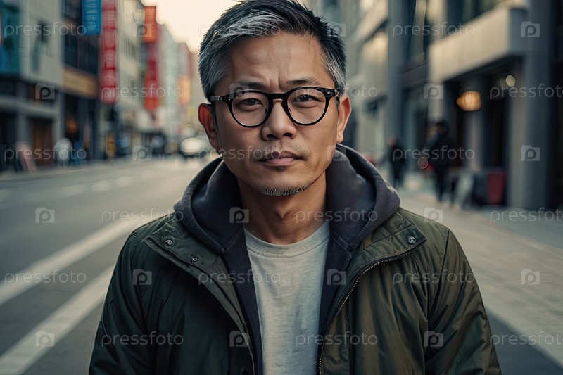 Азиатский профессионал-мужчина в очках, рюкзак с резиновым стеклом, оживленная дорога, мягкая улыбка, стоя. усталость зрения среднего возраста, поиск очков, консультирование, городские условия, фон для текста