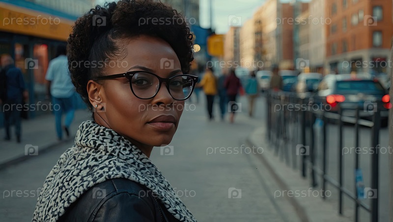Молодая афроамериканка с очками, мозаичный шарф, городская улица в дневное время суток, небольшая тревога. проблемы со зрением у взрослых, поиск правильных очков, урбанистическая сцена, текстовое пространство