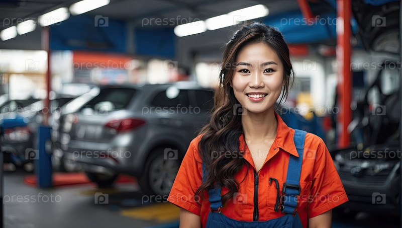Улыбающаяся азиатская женщина автомеханик в красной форме на автомобильной мастерской, уверенный техник, сотрудник, практичный профессионал, современный персонал, текстовая зона