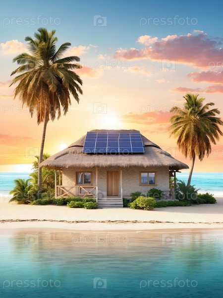 Бунгало на лагуне с солнечной крышей, устойчивый энергетический туризм, семейный эко-отпуск, цифровая живопись, солнечный пальмский ландшафт, зеленое жилье