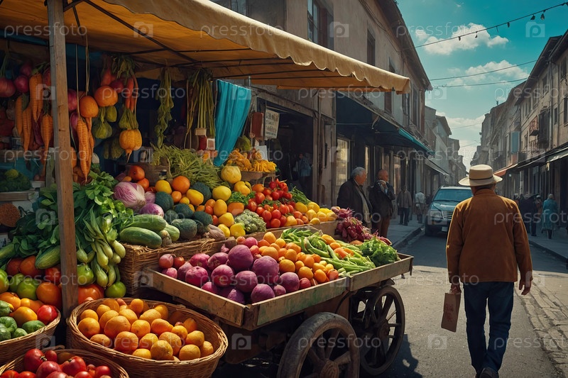 Мобильный эко-магазин со свежими овощами ? уличный рынок, местное семейное мероприятие, зеленый продуктовый магазин, домашние продукты, здоровый городской стол, деревенский киоск, продавец, фестивальный стиль