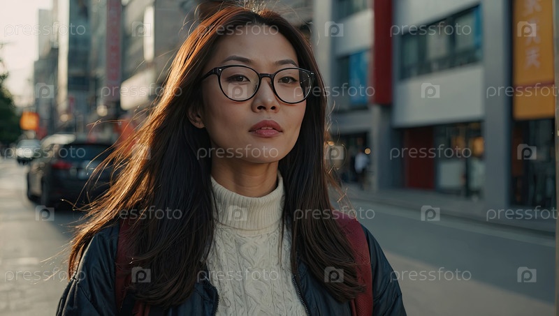 Азиатская женщина с очками, длинные волосы, темный свитер, на открытом воздухе, задумчивое настроение, городская улица