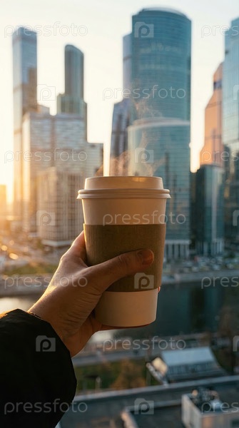 Бумажная чашка кофе, удерживаемая в руке на фоне городского небоскреба, утреннее путешествие по городу, свежий напиток, современная жизнь, выход с восхода солнца, пейзаж города