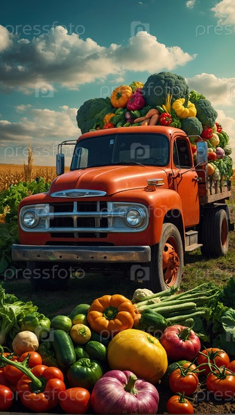 Фермерский грузовик, загруженный свежими овощами ? праздничный осенний урожай, экопродажа, вечеринка с местными продуктами, сельское мероприятие, торжество, бизнес частного фермера, рыночный маркетинг