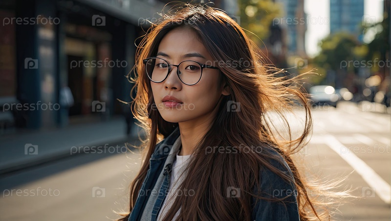 Азиатский подросток в больших прозрачных очках, городская улица, ветровые волосы, задумчивый. неисправность зрения, проблема с рамкой, урбанистическая мода, стильная реклама для клиник, приложения, текстовая зона