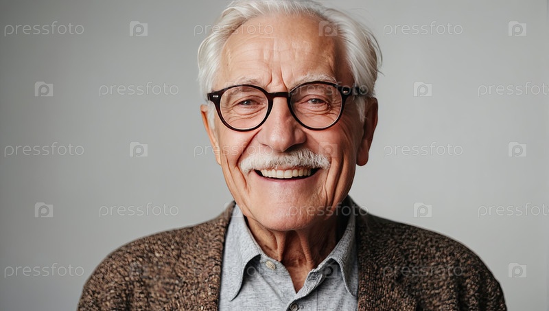 Счастливый пожилой человек в коричневом кардигане и очках, классическая рубашка, нейтральная студия. возрастное ослабление зрения, форма правого стекла, консультационная карта, медицинская брошюра, продвижение оздоровления