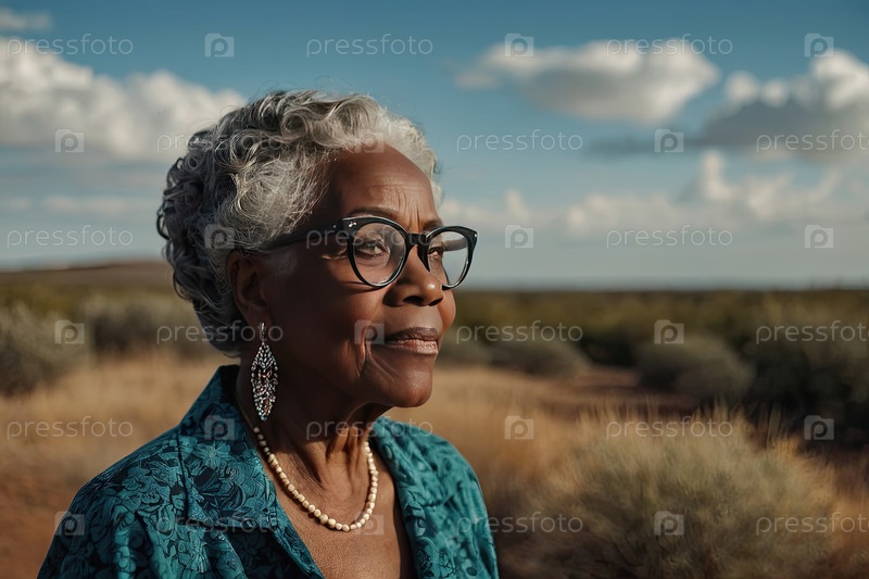 Старшая афроамериканская женщина, классические очки, синий кардиган, тонкие белые волосы, ветреный луг. глаукома, снижение зрения, окислительный стресс, консультирование, реклама поддержки старения, медицинское поле копирайтинг