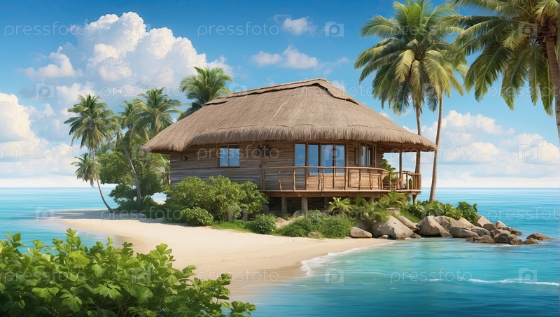Современная вилла на берегу моря под пальмами, частный летний отдых с комплексом "все включено", аренда тропического рая, цифровые художественные произведения из мультфильмов