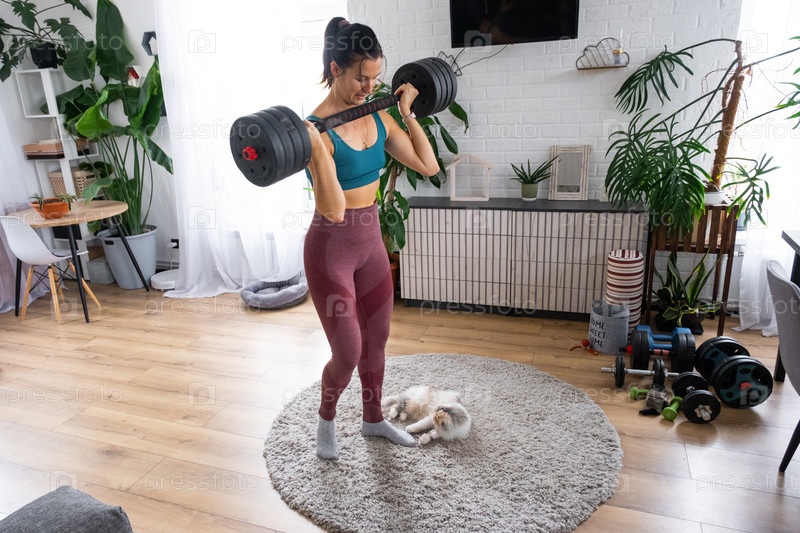 Спортивная молодая женщина, выполняющая силовые тренировки с штангой дома, домашний кот tabby cat смотрящий на ковер, счастливая жизнь, домашняя гимнастическая жизнь, положительная фитнес-концепция