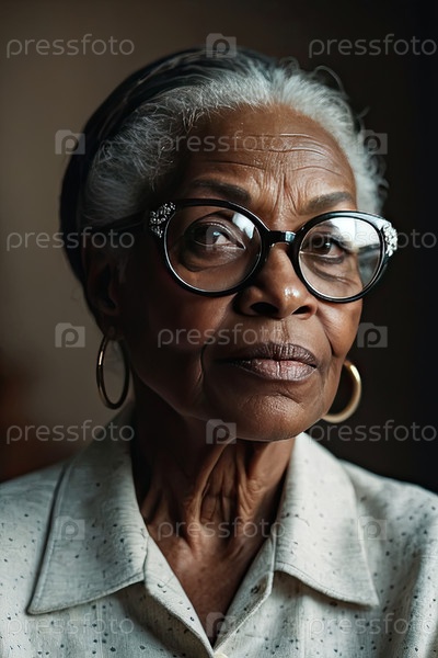Пожилая афроамериканская женщина, классические очки, белая рубашка, жемчуг, темный фон. возрастная макулярная дегенерация, тяжелая глаукома, нарушение зрения, визуальные проекты оздоровления, копирайтинг для клиник