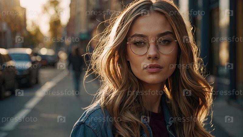 Блондинка в очках, авеню большого города, расслабленное лицо, непринужденная рубашка, закат, мягкий. выбор оптической рамы, легкая потеря зрения, современный городской внешний вид, иллюстрация блога, реклама здоровья, текстовая область