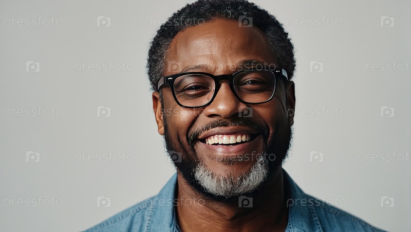Портрет афроамериканца средних лет в очках, улыбающегося в студии.Коррекция зрения для взрослых, проблемы со зрением, оптический отбор, радостные эмоции, изолированный фон, кописпейс
