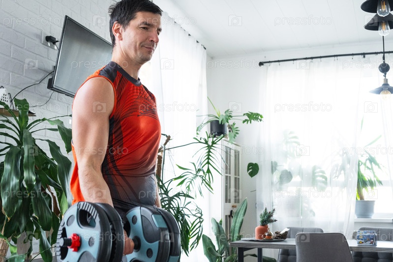 Человек с гантеликами, фитнес дома, современная квартира, тренировочная зона с растениями, рутина спортсмена, сила, здоровые привычки, самообслуживание, домашнее оборудование для тренажерного зала