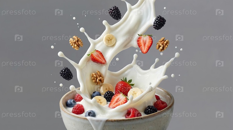 Молоко и клубника брызгают по миске с гранолой, динамичное движение, свежие здоровые завтраки, молочные продукты, белый минимальный фон, яркое утро