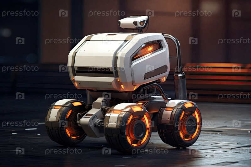 Усовершенствованный белый и оранжевый робот-курьер ориентируется по улицам центра города с коробкой доставки, умной логистикой, мобильностью будущего, экспресс-сервисом городских посылок