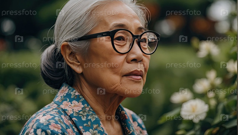 Пожилая азиатская женщина, седые полосатые волосы, прямоугольные очки ремня, улыбка, лиственничный сад. отслоение сетчатки глаза, риск катаракты, размытое зрение, проблема комфорта, весенняя клиника объявление, плакат-заместитель