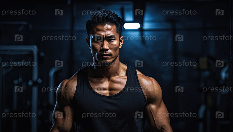 Уверенный тренер азиатского фитнес-клуба, атлетичный мужчина в тренажерном зале, стоящий с перекрещенными руками, спортивная одежда, мотивация, портрет персонала, текстовая зона