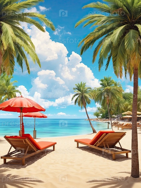 Пляжная релаксация, минимальное количество людей, легкие шезлонги, яркое солнце, реклама отдыха в курортах, туры, профилактика ожогов, использование баннеров