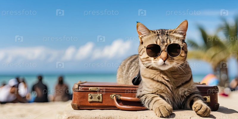Кошка сидит с чемоданом на пляже, туризм, правила полетов животных, дружественное к домашним любимцам жилье, опасность солнца для животных, опекуны за питомцами, туристический веб-материал