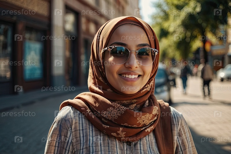 Улыбающаяся арабская женщина в коричневом хиджабе и солнцезащитных очках на улице города с пространством для текста, очков, защиты, оздоровления, городского стиля, здорового образа жизни, консультации, современного внешнего вида
