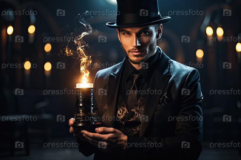 Элегантный мужской фокусник в верхней шляпе, выполняющий магический трюк с таинственным светом в руках, иллюзионистское шоу, театральная магия, фантастическое развлечение