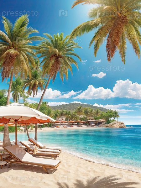 Классический тропический пляж, два шезлонга и зонтик, безопасные каникулы, комфорт, летний отдых, продажи туров, пространство для рекламного слогана в голубом небе