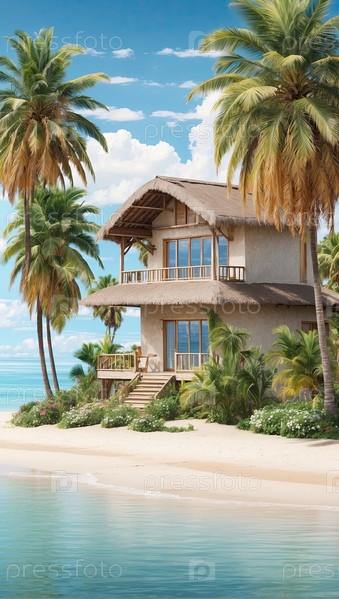 Современная вилла на пляже с пальмами, частный курорт "все включено", живописные летние семейные каникулы, цифровые иллюстрации из мультфильмов