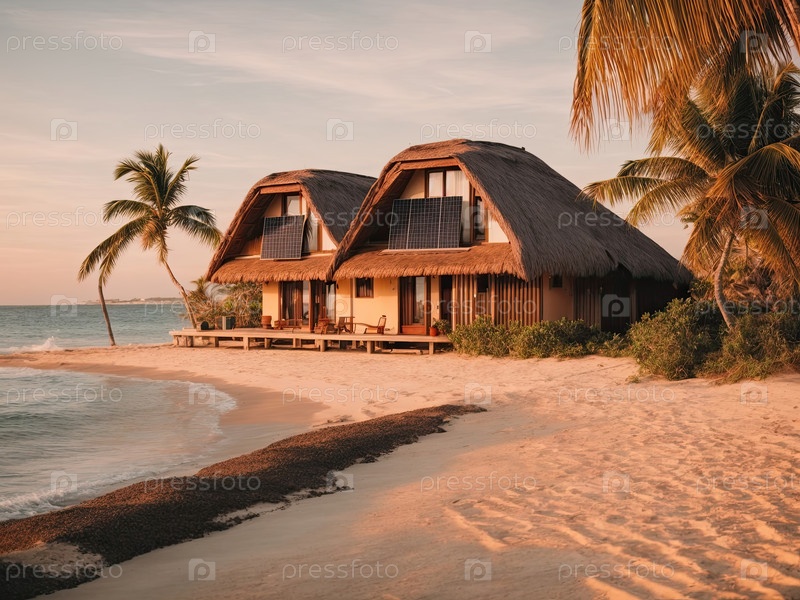 Береговая бунгало на закате с пальмами, частная романтическая вилла, эксклюзивный отдых со всем включенным, цифровая иллюстрация путешествий