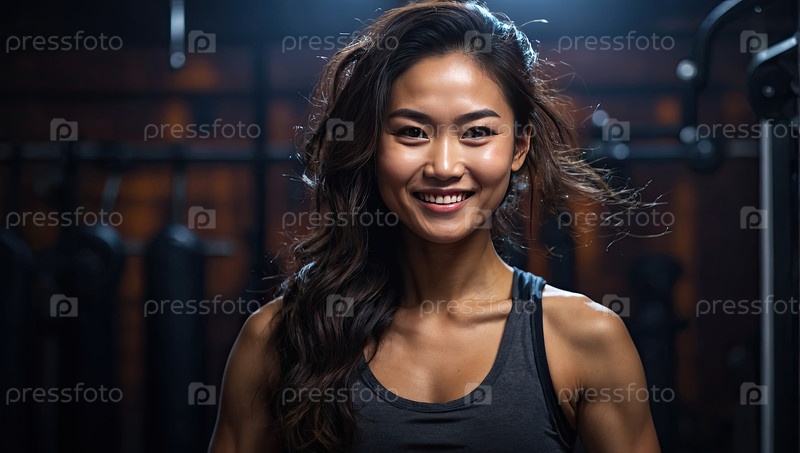 Счастливая азиатская фитнес-тренера, улыбающаяся в тренажерном зале, спортивной одежде, тренеру по оздоровлению, атлетическому персоналу, фитнес-клубу, здоровому образу жизни, промоушенству, веб-странице, месседже