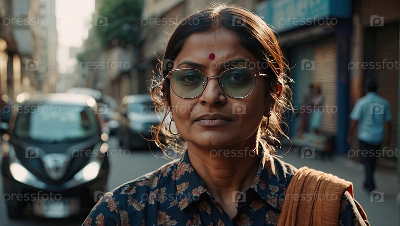 Зрелая южноазиатская женщина в очках, традиционное сари, на городской улице, обеспокоенный вид, сталкивающийся с проблемами со зрением, поиск очков, урбанизм, пространство для текста