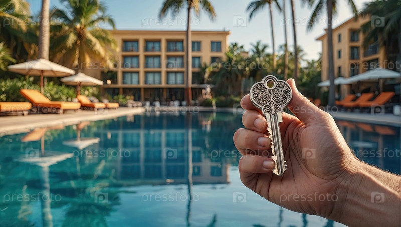 Рука гостя с ключом от гостиничного номера над бассейном, регистрация в курорте, номер "все включено", гостеприимство, ежедневное обслуживание, безопасный отдых