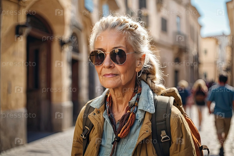 Зрелая женщина-туристка, светлые седые волосы, солнцезащитные очки, куртка хаки, прогулка по старым европейским улицам с рюкзаком. Независимое исследование, навигация, ориентационная проблема, языковое общение