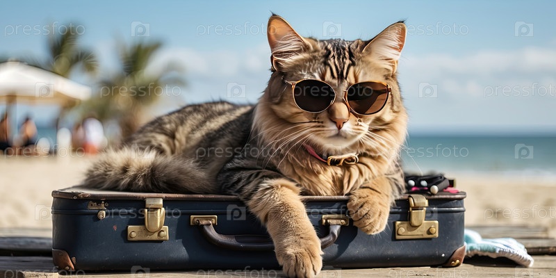 Кошка с багажом на берегу, путеводитель по транспортировке животных, пребывание питомца в отеле, предупреждение о перегреве, временное посадка, использование туристического контента