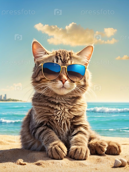 Кошка в солнцезащитных очках на берегу моря, отпуск с домашними животными, правила авиаперевозки, политика гостиничных питомцев, избегание солнечного удара, детский сад для домашних животных, использование блога или брошюры