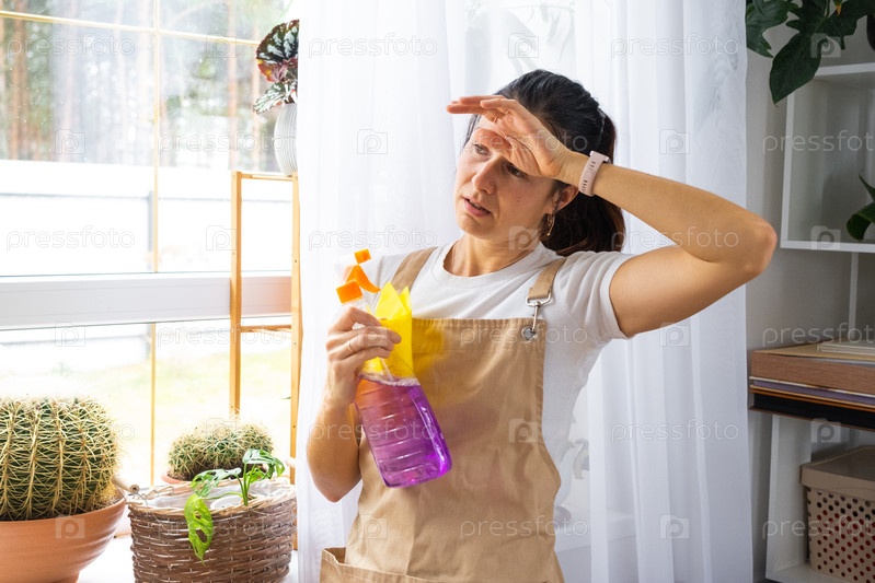 Домашняя хозяйка в фартуке чувствует выгорание, работы по окну, стресс, оранжевые перчатки, рука на лбу, хочет профессиональной помощи, промо сервисного бизнеса