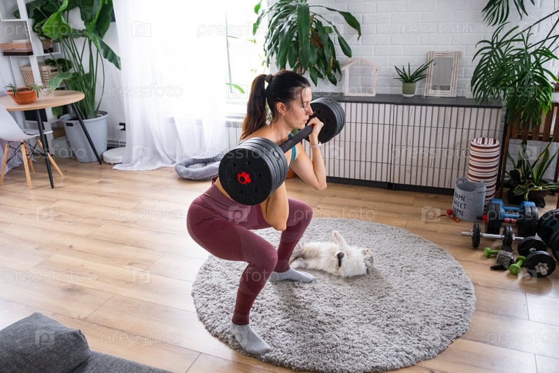 Улыбающаяся женщина приседает с штангой дома, кошачий кот отдыхает на ковре, домашнее оздоровление, связь с питомцами, мотивация к фитнесу, веселая атмосфера квартиры