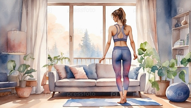 Акварельная иллюстрация женщины, занимающейся фитнесом дома в современной гостиной, здоровый образ жизни, легкость упражнений, оздоровление, для блогов, объявлений, образовательного контента